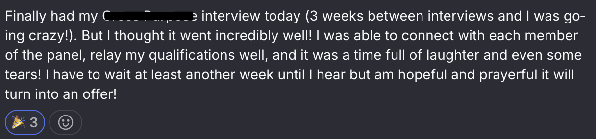 I was able to connect with each member of the panel, relay my qualifications well, and it was a time full of laughter and even some tears!... hopeful and prayerful it will turn into an offer!