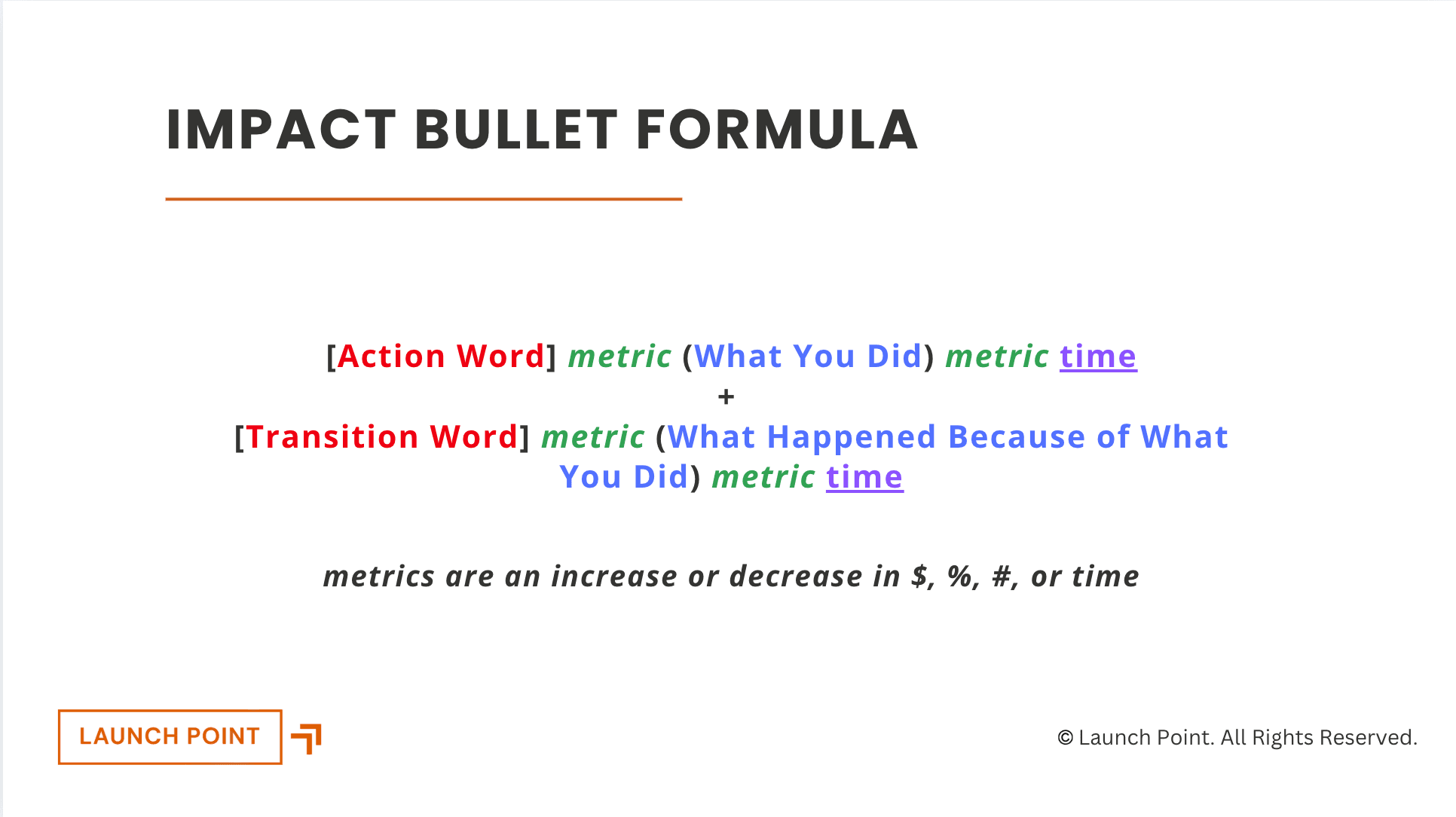 Once the wording is finished, we have to structure the bullet correctly. We call this an Impact Bullet.
