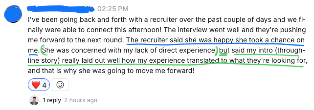 The recruiter said she was happy she took a chance on me. She was concerned with my lack of direct experience, but said my intro (throughline story) really laid out well how my experience translated to what they’re looking for, and that is why she was going to move me forward!