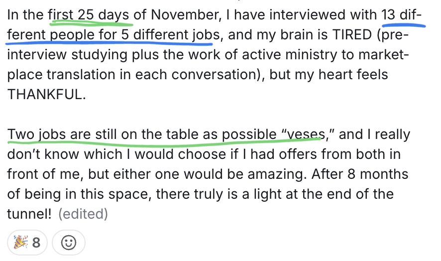 In the first 25 days of November, I have interviewed with 13 different people for 5 different jobs… Two jobs are still on the table as possible “yeses”!