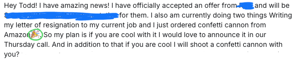 I have amazing news! I have officially accepted an offer… I just ordered a confetti cannon and would love to announce it on our Thursday call.