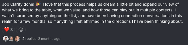 Job Clarity done! 🎉 I love that this process helps us dream a little bit and expand our view of what we bring to the table, what we value, and how those can play out in multiple contexts.