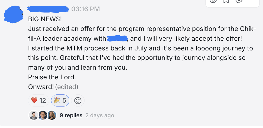 BIG NEWS! Just received an offer for the program representative position for the Chick-fil-A leader academy!